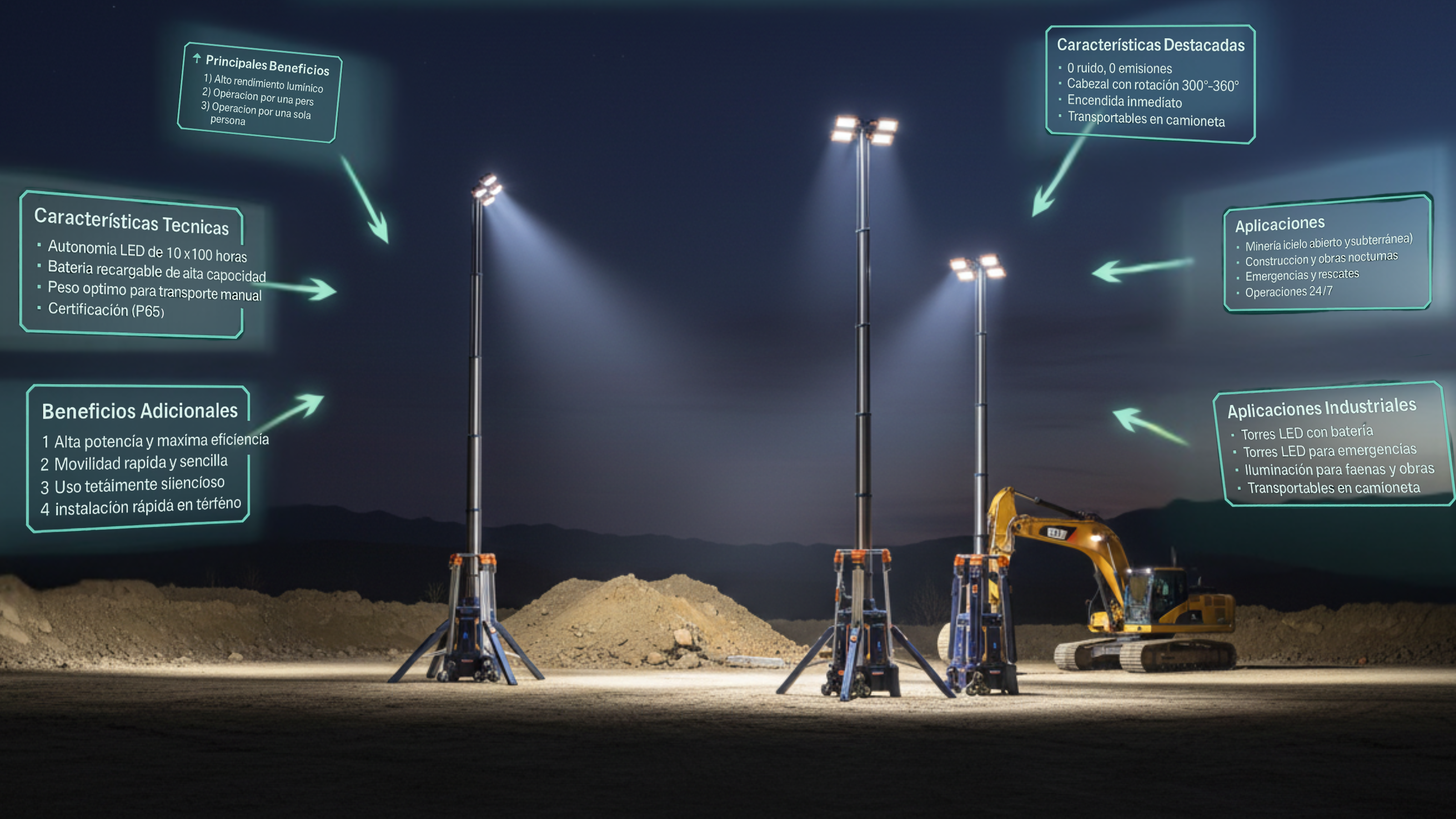 Para empresas mineras, constructoras e industrias que necesitan iluminación y seguridad operativa confiable.